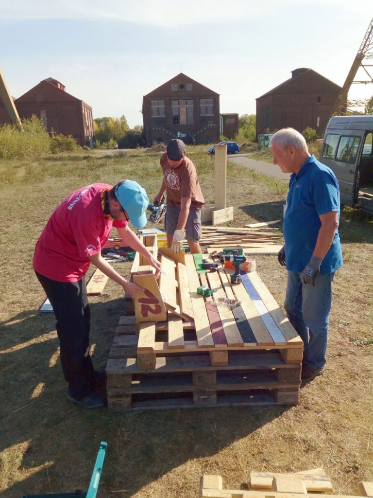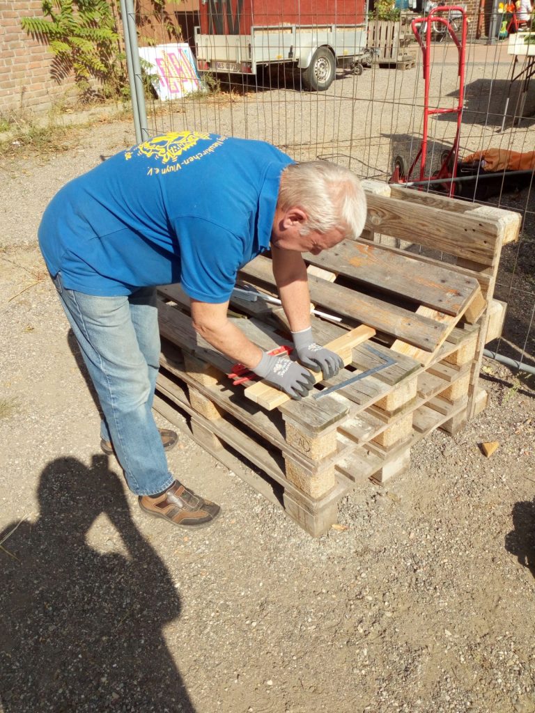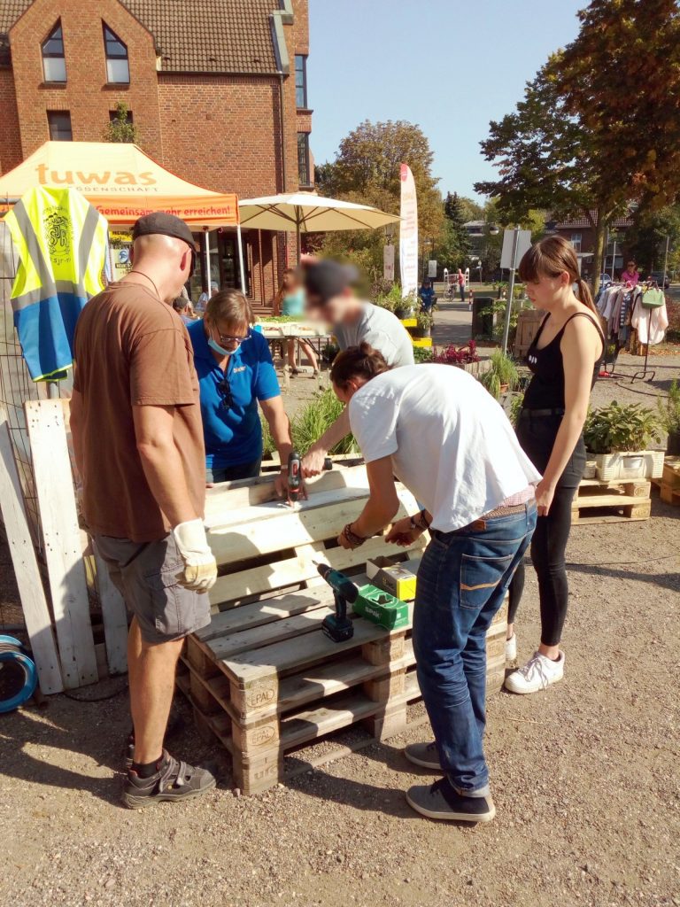 Im Rahmen der europäischen Nachhaltigkeitswoche vom 20. bis zum 26.09.2020 hat der Stadtjugendring gemeinsam mit dem Verein Kulturprojekte Niederrhein und der VHS Neukirchen-Vluyn drei Projekttage organisiert, an denen mit Kindern und Jugendlichen neue Palettenmöbel gebaut wurden.